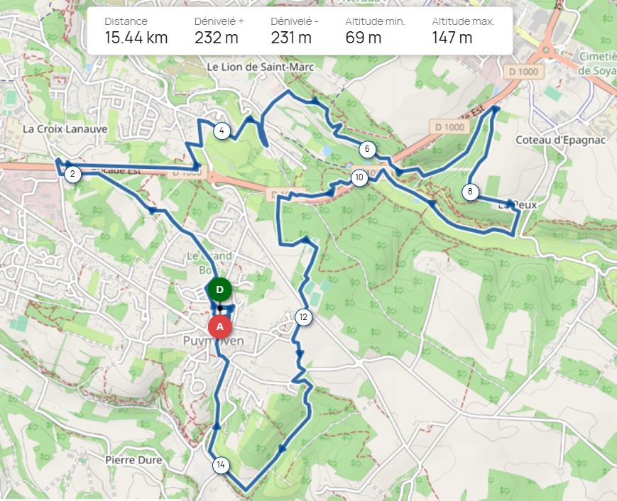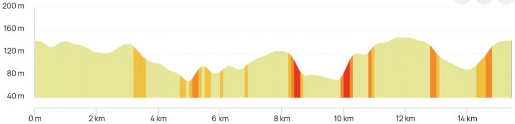 Dénivelé de 262 m soit 17.62 Km d’effort avec 2 ravitaillements (eau, jus de fruits, fruits secs et chocolat).
