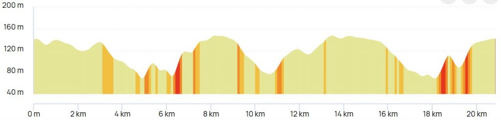 Dénivelé de 358m soit 24.58 km d’effort. 3 ravitaillements sur le parcours (eau, jus d’orange, fruits secs, chocolat).