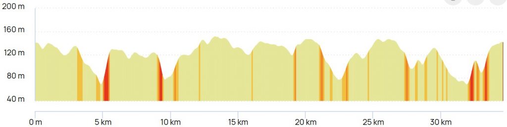 Dénivelé de 532m soit 40,32 km d’effort. 3 ravitaillements sur le parcours (eau, jus d’orange, fruits secs, chocolat).